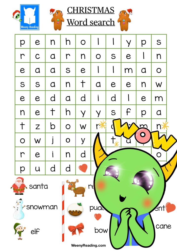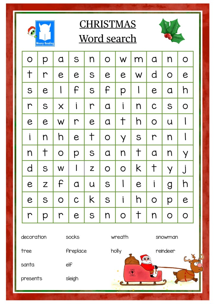 • Christmas Worksheets and more… Christmas word search no.2 Christmas word search no.2⬆️ Free Download Christmas word search no.3⬆️ Free Download Donations greatly appreciated Letter to Santa Letter to Santa ⬆️ Free Download Screenshot Weeny ChristmasFree PDF Download Donations greatly appreciated Screenshot Christmas word search 1 Free Download christmas-go-fish-game⬆️FreeDownload christmas-bingo-8-cards⬆️Download christmas-banner-flags-largeFree Download christmas-banner-flags-small-Free Download christmas-math-numbers and addingFree Download WEENY READING YouTube channel Share this: Click to share on X (Opens in new window) X Click to share on Facebook (Opens in new window) Facebook Like Loading...